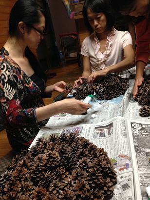 昨日も、ひたすらに、マツカサを組み立てるレッスンでした(笑)